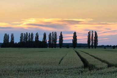 Keywords: sunset landscape trees fields poplars evening sky twilight