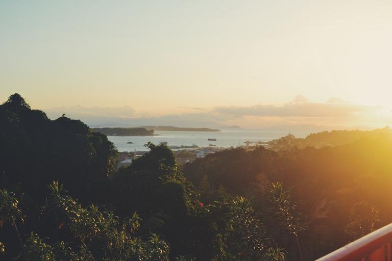 Keywords: sunset landscape trees ocean sea water sky boats ships mountains hills