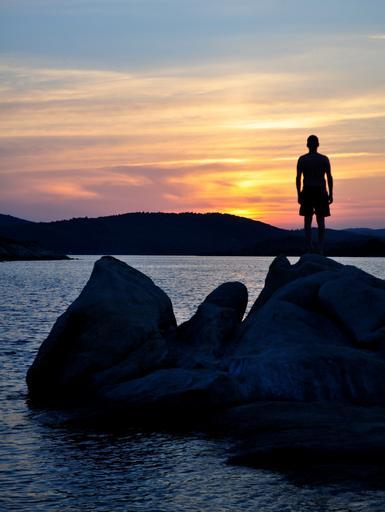 Keywords: sunset ocean boulders rocks man silhouette watching looking enjoying sea water dusk evening landscape person seascape peaceful