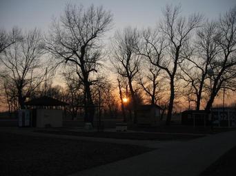 Keywords: sunset park trees woods branches dark silhouettes orange glows glowing sun star evening dusk sunrise dawn mornings pathways walkway buildings