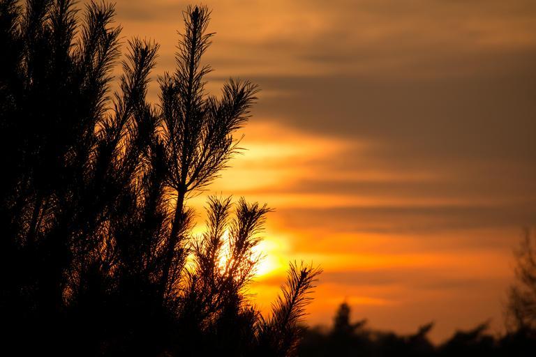 Keywords: sunset pine needles branches yellow orange mood abendstimmung evening heathland wahner pagan silhouette holiday sun romantic