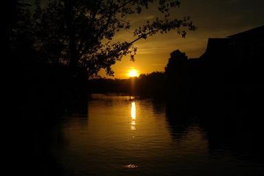 Keywords: sunset river danube water tree road sun evening back light reflection yellow