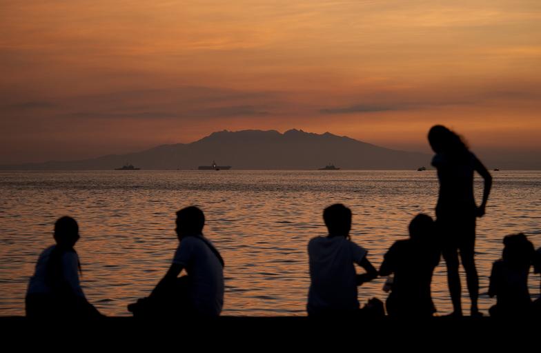 Keywords: sunset seascape water sky people watching enjoying scenic silhouettes sitting standing mountain hill waves ocean sea landscape
