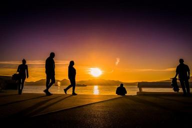 Keywords: sunset seascape water sky people mountains horizon watching enjoying scenic silhouettes walking standing hills waves ocean sea landscape boats ships colorful twilight dusk evening setting sun panorama