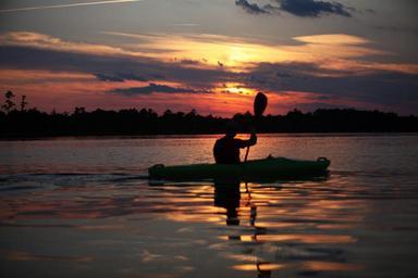 Keywords: sunset sky clouds lake river water reflections canoe man canoeing forest trees woods nature outside peaceful beautiful colorful