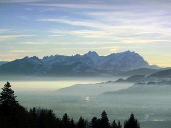 Keywords: sunset sky mountains haze balloon austria snow tree