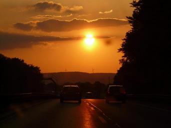 Keywords: sunset sun clouds sky afterglow drive auto travel road traffic remote traffic highway