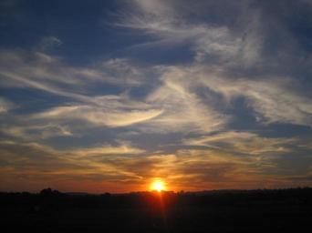 Keywords: sunset sun three quarter orb white centre glowing bright orange yellow clouds white streaky whispy smokey soft blue sky dark horizon