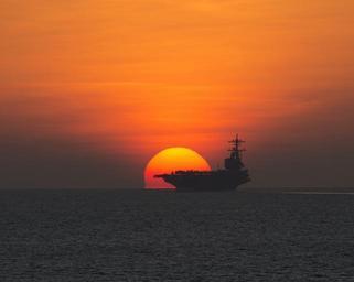Keywords: sunset water ocean silhouette dusk sky aircraft carrier orb outdoor seascape military navy ship vessel horizon