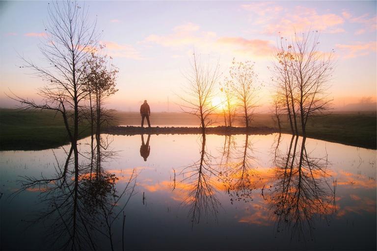 Keywords: sunset water reflection trees pond guy man jacket fog rural clouds