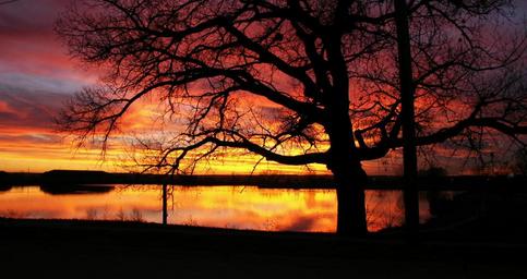 Keywords: sunsets silhouettes trees black darkness orange sky water lakes reflections reflective surfaces plants flora dusk fiery cloudy sunlight nature scenery scenic colorful outdoors