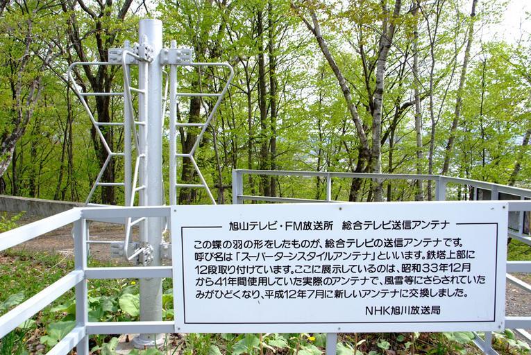 | Keywords: Super Turn Style Antenna.jpg en Super turn style antenna exibited at Mt Asahiyama Asahikawa Hokkaido Japan ja スーパーターンスタイルアンテナ 旭山 信 北海道旭 市 Ozizo's file Ozizo 2009-05-16 Television towers in Hokkaido Mount Asahi Asahikawa NHK Asahikawa Broadcasting Station Japanese language signs |