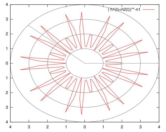 | Keywords: Superellipse gnuplot.svg Eine Superellipse mittels Gnuplot erzeugt own Max Mustermann A1000 <span class signature-talk ></span> Superformula Created with Gnuplot <code> set polar set grid polar 15 a 1 b 1 m 73 n1 2 n2 2 n3 8 h1 t abs cos m/4 t /a n2 h2 t abs sin m/4 t /b n3 set trange -pi pi plot h1 t +h2 t -n1 </code> Cc-zero |