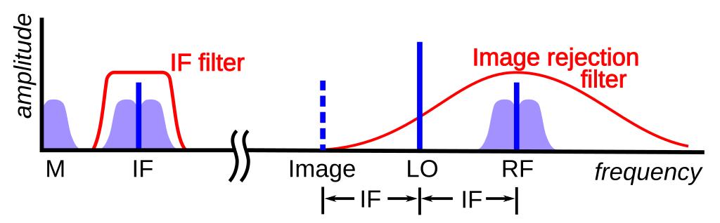 | Keywords: Superheterodyne frequency graph.svg superheterodyne radio receiver receives a radio signal shifting it down to the IF frequency The frequency spectrum of the desired radio transmission is shown at RF it consists of a carrier wave at the center frequency dark blue with sidebands representing the modulation light blue on either side This is mixed with the signal from the local oscillator LO at a lower frequency The result is a heterodyne beat signal called the intermediate frequency at the difference of these two frequencies IF RF ˆ’ LO This is amplified and bandpass red filtered in the IF amplifier and passed through a detector to extract the modulation M <br/><br/> The receiver can also receive signals at the image frequency LO ˆ’ IF so an image rejection filter red is needed on the input to reject this frequency 2016-01-22 own Chetvorno other versions cc-zero Superheterodyne circuits Sideband |