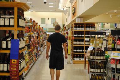 Keywords: supermarket grocery store shopping wine display food market customer shop consumer shelf