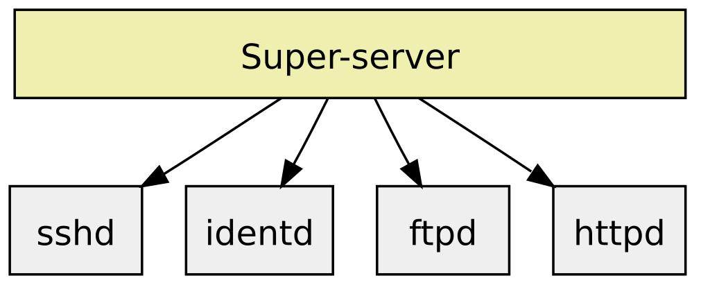 Keywords: Superserver 2.svg I am the author of this image I made it with Graphviz en wikipedia 2007-05-12 Frap wikipedia en Graphviz Source <pre> digraph G node shape box fillcolor efefef style filled fontname Verdana; Super-server fillcolor efefaf width 3 8; Super-server ->sshd Super-server ->identd Super-server ->ftpd Super-server ->httpd </pre> Frap Original upload log en wikipedia Superserver svg wikitable - 2007-05-12 14 53 290×120× 2875 bytes Frap Transparent background - 2007-05-12 14 52 290×120× 2962 bytes Frap fix - 2007-05-12 14 29 512×512× 3199 bytes Frap I am the author of this image I made it myself with Graphviz and a text editor - 2007-05-12 14 25 512×512× 3201 bytes Frap I am the author of this image I made it with Graphviz - 2007-05-12 14 19 355×145× 3232 bytes Frap I am the author of this image I made it with Graphviz Computer architecture diagrams