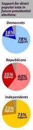 | Keywords: Support For Direct Popular Vote.png Responses to the question For future presidential elections would you support or oppose changing to a system in which the president is elected by direct popular vote instead of by the electoral college Data from Washington Post-Kaiser Family Foundation-Harvard University Survey of Political Independents conducted May-June 2007 available at http //www washingtonpost com/wp-srv/politics/interactives/independents/post-kaiser-harvard-topline pdf Own 2008-05-04 Szu Election apportionment diagrams of the United States Opinion polls |