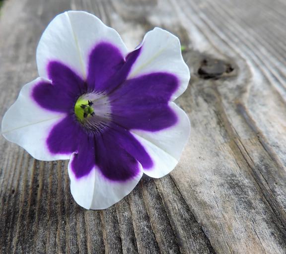 Keywords: surfinien flowers blossom bloom violet white wooden board branch purple summer flower