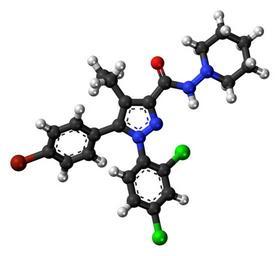 | Keywords: Surinabant 3D ball.png Ball-and-stick model of the surinabant molecule a potential treatment for nicotine addiction Colour code 505050 Carbon C black<br> F0F0F0 Hydrogen H white<br> F51E1E Oxygen O red<br> 3C50FA Nitrogen N blue<br> 14F014 Chlorine Cl green<br> B42814 Bromine Br red-brown<br> 2011-07-15 own DS Visualizer Jynto talk Space-filling version cc-zero Images by Jynto Piperidines Hydrazides Pyrazoles Cannabinoid antagonists Cannabinoids Bromobenzenes Ball-and-stick models Dichlorobenzenes |