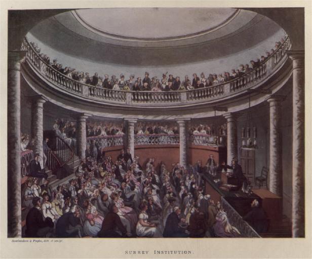 Keywords: Surrey Institution.jpg Lecture Hall of the Surrey Institution This engraving was published as Plate 81 of Microcosm of London 1810 see File Microcosm of London Plate 081 - Surrey Institution jpg The Microcosm of London or London in Miniature volume III by Rudolph Ackermann 1810 republished by Methuen 1904 1810 Thomas Rowlandson 1756 1827 and Augustus Charles Pugin 1762 1832 after John Bluck fl 1791 1819 Joseph Constantine Stadler fl 1780 1812 Thomas Sutherland 1785 1838 J Hill and Harraden aquatint engravers PD-old-100-1923 <gallery> File Surrey Institution London circa 1810 - cropped jpg Crop File Microcosm of London Plate 081 - Surrey Institution jpg Another scan from the book File Microcosm of London Plate 081 - Surrey Institution tone jpg Tone modified of the scan </gallery> Microcosm of London Volume 3 Organisations of the United Kingdom Science and technology in London Education in England Learned societies of the United Kingdom Building interiors in London |