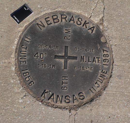 Keywords: Survey monument JF00-072 disc marker 2.JPG en Survey monument JF00-072 located on Nebraska-Kansas state line at intersection of Nebraska counties Thayer and Jefferson and Kansas counties Washington and Republic; marking the intersection of 40 degrees north latitude and the Sixth Principal Meridian Metal disc manhole cover in center of intersection of county roads The black pocket notebook at upper left measures 3 by 5 inches 7 6 x 12 7 cm 2012-03-09 own Ammodramus cc-zero Uploaded with UploadWizard Pictures by Ammodramus Taken with Panasonic Lumix DMC-FZ20 Survey monument JF00-072 Kansas-Nebraska