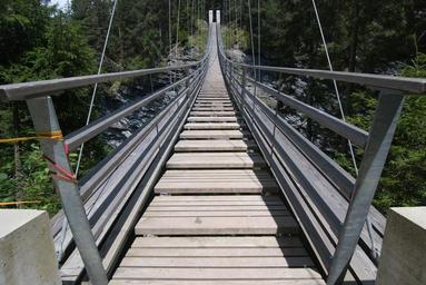 Keywords: suspension bridge hike bridge trek mountain hanging nature travel symmetrical cable wood hiking outdoors summer perspective