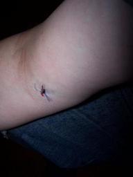 | Keywords: Suture - Landscaping Accident.jpg I received three stitches after I knelt down to spread bark and a kitchen knife that was in a pocket on my pants leg which I had been using to cut open bags of bark punctured my upper right arm nearly missing an artery and a bundle of nerves enwp 2007-12-21 en wikipedia Richardevan Surgical suture |