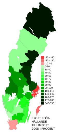 | Keywords: Svenska läns export i förhållande till import 08.svg sv Svenska läns export i förhållande till import 2008 Ett negativt värde innebär att länet importerar mer än det exporterar http //www regeringen se/content/1/c6/14/84/94/43e2a84c pdf Länens totala export 2008 och 2009 miljarder SEK och http //www regeringen se/content/1/c6/14/84/94/d416f71f pdf Länens totala import 2002-2009 miljarder SE <br>Map from File SWE-Map Län svg by Lokal_Profil Marcusroos 2010-06-29 SVG maps of Sweden Economic maps of Sweden |