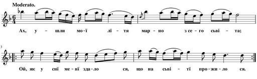 | Keywords: Об смертному часу.svg uk Ілюст ація до статті иколи Лисенка а одні музичні ст ументи на Вк аїнї оти на одної псальми Об сме тному часу 1894-04-27 Зо я часопис 1894 08 с 185-187 а одні; записано иколою Лисенком other versions Часопис Зо я 1894 08 pdf Hidden background ECECEC; white;color black border 1px grey solid; padding 2px Created by MuseScore <nowiki> < xml version 1 0 encoding UTF-8 > <museScore version 2 06 > <programVersion>2 0 2</programVersion> <programRevision>f51dc11</programRevision> <Score> <LayerTag id 0 tag default ></LayerTag> <currentLayer>0</currentLayer> <Synthesizer> </Synthesizer> <Division>480</Division> <Style> <lastSystemFillLimit>0</lastSystemFillLimit> <TextStyle> <halign>center</halign> <valign>baseline</valign> <xoffset>0</xoffset> <yoffset>6</yoffset> <offsetType>spatium</offsetType> <name>Lyrics Odd Lines</name> <family>FreeSerif</family> <size>11</size> <bold>1</bold> <sizeIsSpatiumDependent>1</sizeIsSpatiumDependent> </TextStyle> <page-layout> <page-height>368 504</page-height> <page-width>1190 55</page-width> <page-margins type even > <left-margin>5 66929</left-margin> <right-margin>5 66929</right-margin> <top-margin>56 6929</top-margin> <bottom-margin>113 386</bottom-margin> </page-margins> <page-margins type odd > <left-margin>5 66929</left-margin> <right-margin>5 66929</right-margin> <top-margin>0</top-margin> <bottom-margin>0</bottom-margin> </page-margins> </page-layout> <Spatium>1 764</Spatium> </Style> <showInvisible>1</showInvisible> <showUnprintable>1</showUnprintable> <showFrames>1</showFrames> <showMargins>0</showMargins> <metaTag name arranger ></metaTag> <metaTag name composer ></metaTag> <metaTag name copyright ></metaTag> <metaTag name creationDate >2015-11-28</metaTag> <metaTag name lyricist ></metaTag> <metaTag name movementNumber ></metaTag> <metaTag name movementTitle ></metaTag> <metaTag name platform >Microsoft Windows</metaTag> <metaTag name poet ></metaTag> <metaTag name source ></metaTag> <metaTag name translator ></metaTag> <metaTag name workNumber ></metaTag> <metaTag name workTitle ></metaTag> <PageList> <Page> <System> </System> <System> </System> </Page> </PageList> <Part> <Staff id 1 > <StaffType group pitched > <name>stdNormal</name> </StaffType> </Staff> <trackName>Violin</trackName> <Instrument> <longName>Violin</longName> <shortName>Vln </shortName> <trackName>Violin</trackName> <minPitchP>55</minPitchP> <maxPitchP>103</maxPitchP> <minPitchA>55</minPitchA> <maxPitchA>88</maxPitchA> <instrumentId>strings violin</instrumentId> <Articulation> <velocity>100</velocity> <gateTime>100</gateTime> </Articulation> <Articulation name staccatissimo > <velocity>100</velocity> <gateTime>33</gateTime> </Articulation> <Articulation name staccato > <velocity>100</velocity> <gateTime>50</gateTime> </Articulation> <Articulation name portato > <velocity>100</velocity> <gateTime>67</gateTime> </Articulation> <Articulation name tenuto > <velocity>100</velocity> <gateTime>100</gateTime> </Articulation> <Articulation name marcato > <velocity>120</velocity> <gateTime>67</gateTime> </Articulation> <Articulation name sforzato > <velocity>120</velocity> <gateTime>100</gateTime> </Articulation> <Channel> <program value 40 /> <synti>Fluid</synti> </Channel> <Channel name pizzicato > <program value 45 /> <synti>Fluid</synti> </Channel> <Channel name tremolo > <program value 44 /> <synti>Fluid</synti> </Channel> </Instrument> </Part> <Staff id 1 > <Measure number 1 > <KeySig> <accidental>-1</accidental> </KeySig> <TimeSig> <sigN>6</sigN> <sigD>4</sigD> <showCourtesySig>1</showCourtesySig> </TimeSig> <Tempo> <tempo>1 83333</tempo> <text>Moderato </text> </Tempo> <Chord> <durationType>quarter</durationType> <Lyrics> <text>Ах </text> </Lyrics> <Note> <Accidental> <role>1</role> <subtype>flat</subtype> </Accidental> <pitch>82</pitch> <tpc>12</tpc> </Note> </Chord> <Slur id 2 > <track>0</track> <SlurSegment no 0 > <o4 x 0 449972 y 0 149991 /> </SlurSegment> </Slur> <Chord> <durationType>eighth</durationType> <Lyrics> <syllabic>begin</syllabic> <text>у</text> </Lyrics> <Slur type start id 2 /> <Note> <pitch>81</pitch> <tpc>17</tpc> </Note> </Chord> <Chord> <durationType>16th</durationType> <Note> <pitch>82</pitch> <tpc>12</tpc> </Note> </Chord> <Chord> <durationType>16th</durationType> <Slur type stop id 2 /> <Note> <pitch>81</pitch> <tpc>17</tpc> </Note> </Chord> <Slur id 3 > <track>0</track> <SlurSegment no 0 > <o4 x 0 299981 y 0 149991 /> </SlurSegment> </Slur> <Chord> <BeamMode>begin</BeamMode> <durationType>16th</durationType> <Lyrics> <syllabic>end</syllabic> <text>шли</text> </Lyrics> <Slur type start id 3 /> <Note> <pitch>79</pitch> <tpc>15</tpc> </Note> </Chord> <Chord> <durationType>16th</durationType> <Note> <pitch>77</pitch> <tpc>13</tpc> </Note> </Chord> <Chord> <durationType>16th</durationType> <Slur type stop id 3 /> <Note> <pitch>76</pitch> <tpc>18</tpc> </Note> </Chord> <Chord> <BeamMode>no</BeamMode> <durationType>16th</durationType> <Lyrics> <syllabic>begin</syllabic> <text>мо</text> </Lyrics> <Note> <pitch>77</pitch> <tpc>13</tpc> </Note> </Chord> <Slur id 4 > <track>0</track> <SlurSegment no 0 > <o4 x 0 149991 y -0 449972 /> </SlurSegment> </Slur> <Chord> <durationType>eighth</durationType> <Lyrics> <syllabic>end</syllabic> <text>ї</text> </Lyrics> <Slur type start id 4 /> <Note> <pitch>79</pitch> <tpc>15</tpc> </Note> </Chord> <Chord> <durationType>16th</durationType> <Note> <pitch>81</pitch> <tpc>17</tpc> </Note> </Chord> <Chord> <durationType>16th</durationType> <Slur type stop id 4 /> <Note> <pitch>79</pitch> <tpc>15</tpc> </Note> </Chord> <Slur id 5 > <track>0</track> </Slur> <Chord> <dots>1</dots> <durationType>quarter</durationType> <Lyrics> <syllabic>begin</syllabic> <text>лї</text> </Lyrics> <Slur type start id 5 /> <Note> <pitch>77</pitch> <tpc>13</tpc> </N