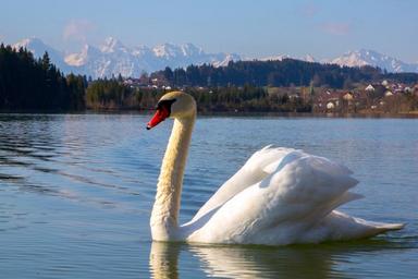 Keywords: swan bird white lake water bird nature fly departure goose animal world animal duck bird gooseneck water daybreak lechbruck mountains bavaria landscape sky mirroring blue swim