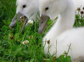 Keywords: swan cub bird lawn white grazing