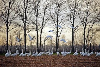 Keywords: swan migratory bird whooper swan bird arable field rest sky clouds