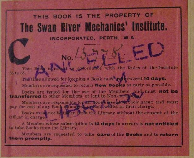 Keywords: Swan River Mechanics Institute Library Paste down.jpg en Swan River Mechanics Institute Library Paste down - pre First World War book stamp photograph of bookplate from pre 1914 author before 1908 PD-Australia Swan River Mechanics' Institute Rubber stamp imprints Labels in books |