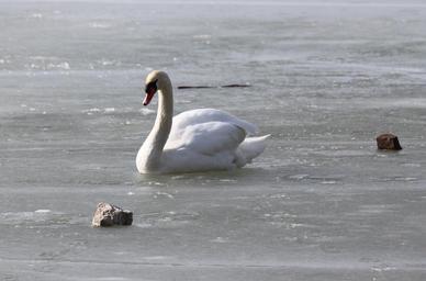 Keywords: swan swans murten morat lake water switzerland landscape waters nature natural water bird white frozen iced ice winter cold region of lake murten icy sky
