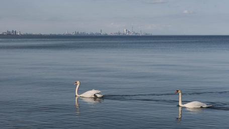 Keywords: nikon cn d750 darling jack lake mississauga ontario park skyline swans toronto tower marsh rattray outdoor bird animal The Toronto skyline is visible in the distance. The Toronto skyline is visible in the distance.