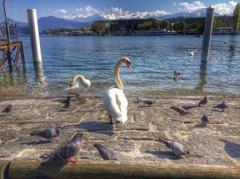Keywords: swans lucerne blue water sky landscape clouds nature animals switzerland