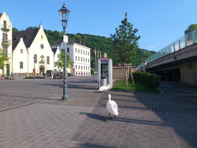 Keywords: swans swan bird animals birds city river rhine old town ehrenbreitstein koblenz walk sachsen phone booth