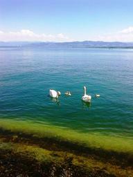 Keywords: swans swan family animal water waters bird birds lake white pride nature blue lake constance switzerland landscape background romanshorn sky