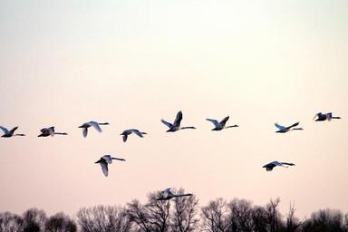 Keywords: swans swan flight fly evening sun