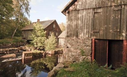 Keywords: sweden barn house home wooden farm rural rustic stream creek water reflections rocks nature outside country countryside