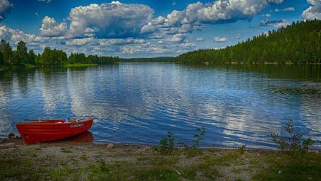 Keywords: sweden lake saxen water reflections sky clouds hdr forest trees woods boat shoreline shore nature outside country countryside