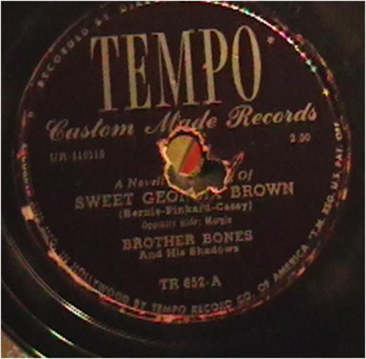 | Keywords: Sweet Georgia Brown Tempo Lable Recorded by Brother Bones and His Shadows.PNG en Record label from TEMPO Records for the Sweet Georgia Brown Recording by Brother Bones and His Shadows Picture taken from an actual Vinay Recording Author 2011-04-04 Cc-zero Check categories 2011 April 5 en wikipedia Brother_Bones en wikipedia Tempo_Records_ US 6 Percussionists from the United States People of Montgomery Alabama Whistlers 1974 deaths 1902 births Musicians from Alabama Record labels | ||||