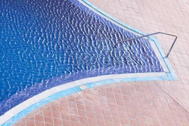 Keywords: swimming pool entry handrail steel chrome plated tiles water wind ruffled wave overflow blue turquoise 70 years