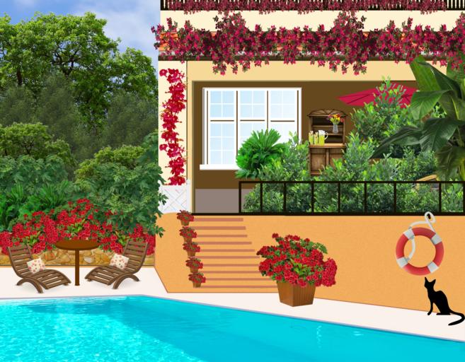 Keywords: swimming pool house lifebuoy sun loungers table potted flowers black cat staircase flower pots water window cabinet trees shrubs flower garlands red