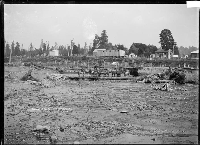 MAKE A MEME View Large Image View of Ohakune, with a stony river bed in the foreground, a team of horses hauling a heavily laden cart across a ford in the river, and a swing footbridge behind the ford. Photograph taken by William A Price, circa 1910. Inscriptions: ...