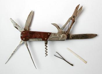 | Keywords: Swiss army similar knife(top).jpg 'swiss army'-look knife with similar functionality Made in Russia in about 1980-s in Nizhniy Novgorod Includes large blade small blade scissors can opener scredriver awl file corkscrew tweezers and toothpick About 80mm length It's used very often so saved not so good Own 2007-08-13 Krr Multi-tool_knives Corkscrew tool - Swiss-knife |