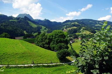 Keywords: swiss switzerland mountain scenery european alps landscape scenic outdoor green summer green leaves forest foliage sunlight
