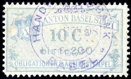 | Keywords: Switzerland Basel 1883 stocks and bonds revenue 10c - 1A.jpg en Switzerland Basel 1883 stocks and bonds revenue stamp 10c - 1A type 1 with inscription 'OBLIGATIONEN ACTIENSTEMPEL' Perforated 11 5 1883 own scan Government of Basel other versions Custom license marker 2016 12 26 PD-old-100 Revenue stamps of Switzerland Stocks bonds revenue stamps Business rubber stamps 1883 stamps of Basel | ||||