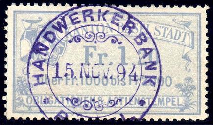 | Keywords: Switzerland Basel 1883 stocks and bonds revenue 1.20Fr - 5B.jpg en Switzerland Basel 1883 stocks and bonds revenue stamp 1 20Fr - 5B type 1 with inscription 'OBLIGATIONEN ACTIENSTEMPEL' Perforated 12 75-13 1883 own scan Government of Basel other versions Custom license marker 2016 12 26 PD-old-100 Revenue stamps of Switzerland Stocks bonds revenue stamps Business rubber stamps 1883 stamps of Basel | ||||