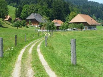 Keywords: switzerland buildings landscape lane fields summer spring nature outside outdoor sunny plants grass farm rural beautiful country countryside fence dirt road